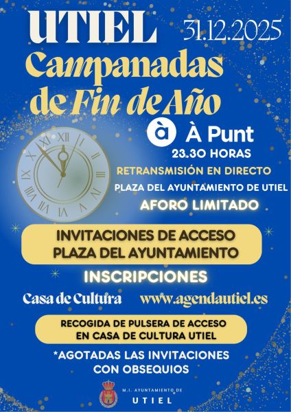 El miércoles 31 de diciembre, a partir de las 23.30 horas, À Punt retransmitirá en directo las campanadas de Fin de Año desde la Plaza del Ayuntamiento de Utiel.